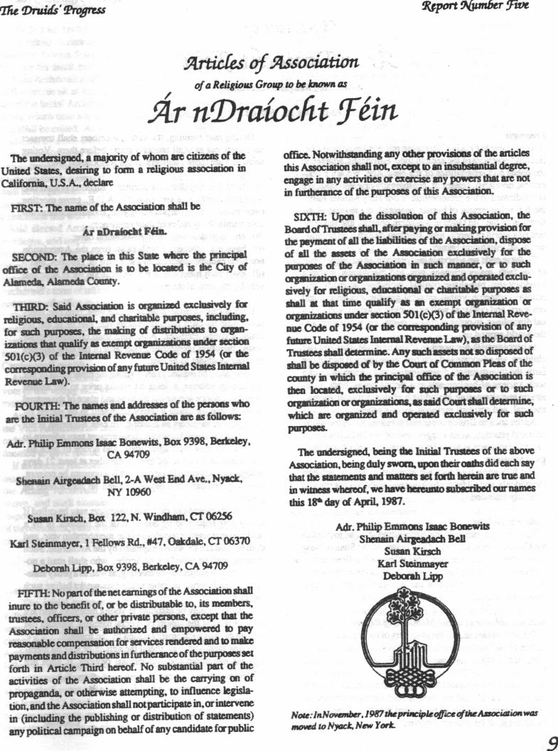 The purpose of this letter is an announcement of, and an invitation for your participation in, the creation of: Ár nDraíocht Féin. The Irish words (pronounced "arn ree-ocht fane") mean "Our own Druidism," and that's what I have in mind -- a brand new form of Druidism, not just Pan-Celtic, but Pan-European. (By this latter term, I mean to include any of the European branches of the Indo-European culture and language tree -- Celtic, Germanic, Slavic, Baltic, even the pre-Classical Greek & Roman.) Paradoxically, this would resemble the original Paleopagan Druidism far more than any efforts of the last thousand years. It would be based on the best scholarly research available, combined with what has been learned (about art, psychology, small group politics and economics) through the theory and practice of modern Neopaganism, and my own knowledge of the polytheological and practical derails of magical and religious phenomena.