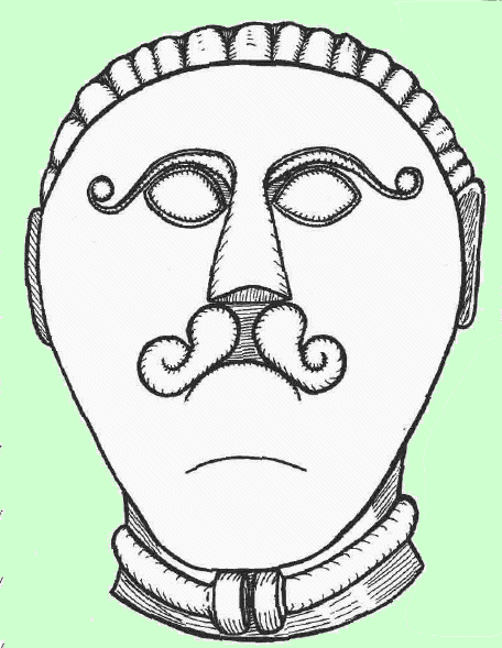 This carved stone head was found at the eastern end of the Celtic lands, in what is now the Czech Republic. It shows a Celtic man in the traditional style of his people. His hair is combed straight back, his big curling mustache covers his lip, and his strong jaw gives him a courageous look. Around his neck is a torc, the symbol of Celtic tribal identity or nobility. We don't know who the statue might be. It: could be a specific Chief or King, it could be one of the Holy Ancestors, or it could be a God.